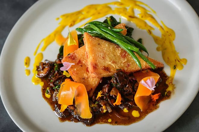 -Salsa macha, huitlacoche + nopale fritter, mole amarillo