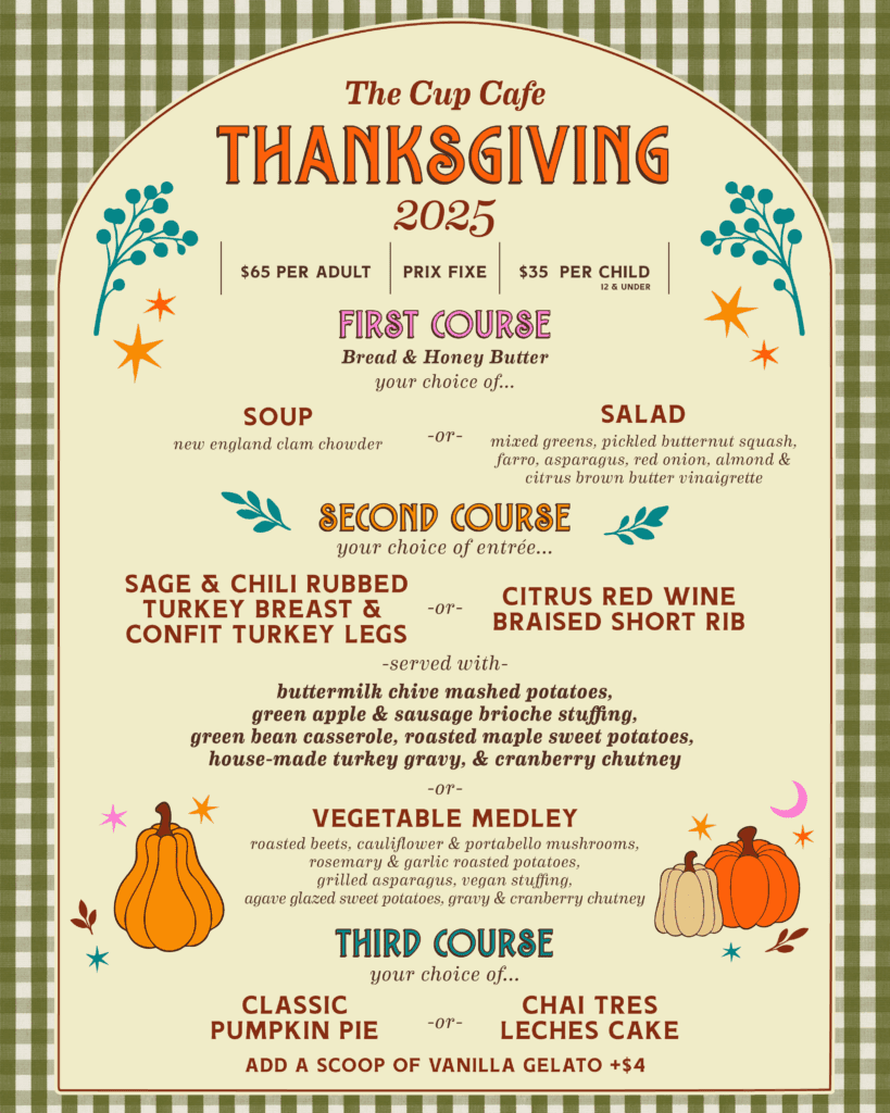 **The Cup Cafe does not accept reservations for breakfast or lunch service, except for the following holidays: Easter, Mother’s Day, Thanksgiving, and Christmas Day**