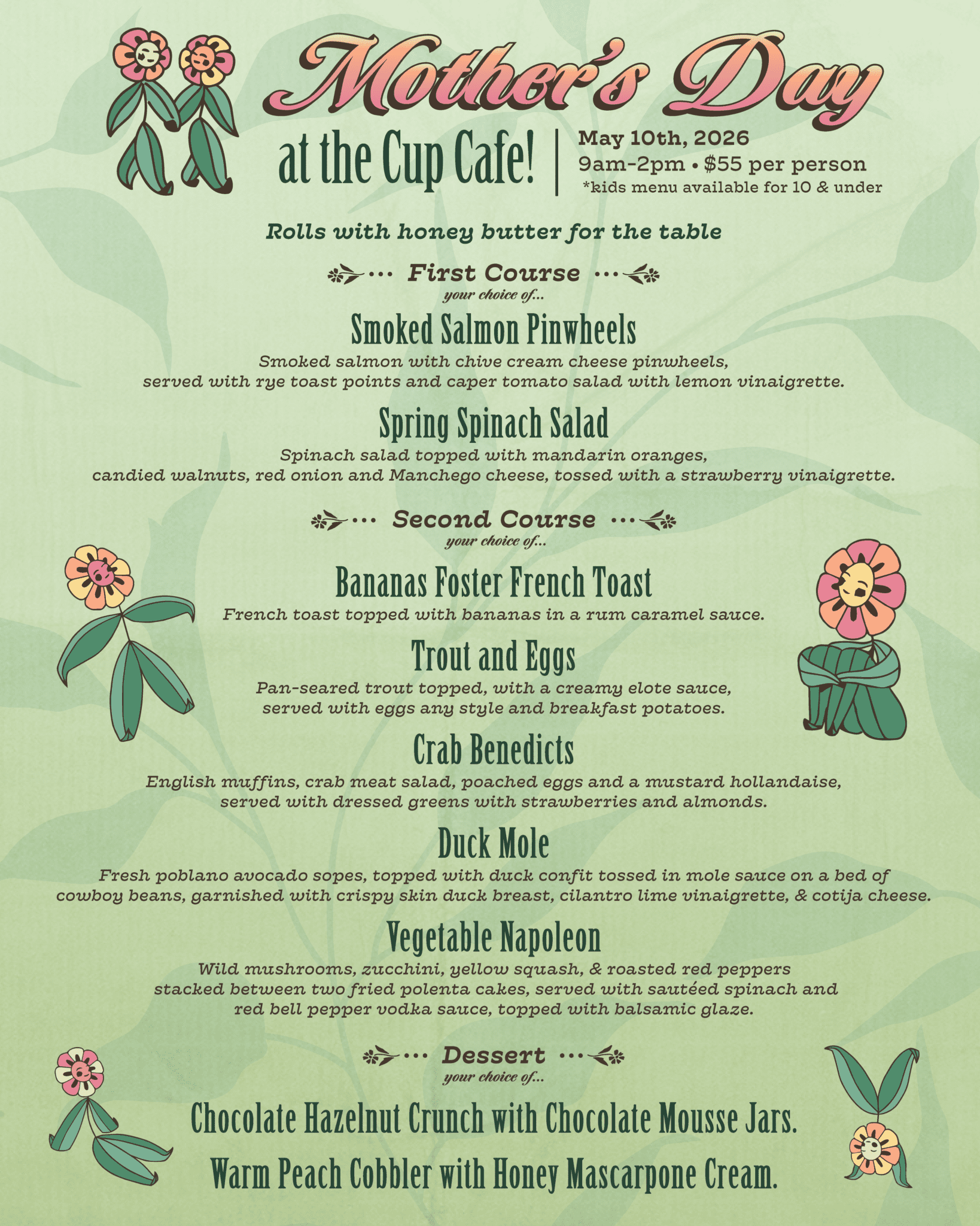 **The Cup Cafe is now accepting reservations for breakfast and lunch service, Monday through Thursday. Reservations are not available on Friday, Saturday, and Sunday for breakfast or lunch. Dinner reservations are available 7 days a week. Reservations are highly recommended for the following holidays: Easter, Mother’s Day, Thanksgiving, and Christmas Day. **